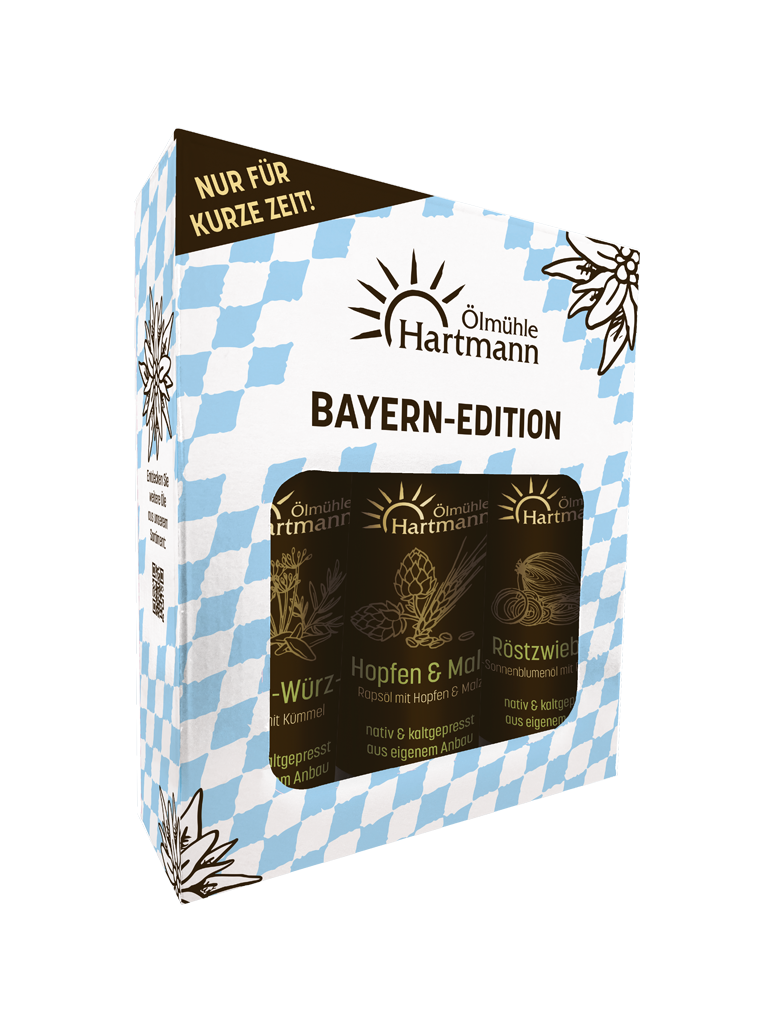 Bayerische Genussmomente bietet ab sofort die neue, limitierte Sonderedition „Bayern“ der Ölmühle Hartmann. Das Dreier-Set überzeugt mit einem Röstzwiebelöl, einem Hopfen & Malz Öl und einem Kümmel-Würz Öl, alle drei Flaschen mit jeweils 100 ml Inhalt. Diese neuen Mischungen sind ideal für den Einsatz in der einzigartigen deftigen, bayerischen Küche. Egal ob Kässpatzen, Wurstsalat, Obazda, Krustenbraten, Krautsalat, Bratkartoffel oder eins der vielen anderen, typisch bayerischen Gerichte: Sie alle lassen sich mit einem Schuss der neuen kaltgepressten Öle verfeinern. Die drei Ölkreationen der limitierten Sonderedition im bayerischen „Outfit“ sind ausschließlich mit natürlichen Zutaten gefertigt und hitzebeständig.