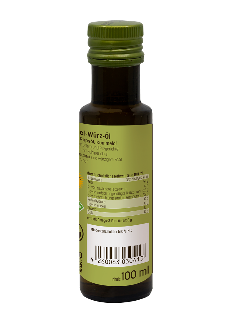 - Das Kümmel-Würz-Öl ist besonders geeignet für die Zubereitung von Kraut- und Kohlgerichten, bei denen der feine Geschmack des Kümmels perfekt harmoniert. Auch Bratkartoffeln, Pilzgerichte und andere herzhafte Speisen profitieren von dem aromatischen Profil dieses Öls. Es verleiht jedem Gericht eine würzige, leicht anregende Note.