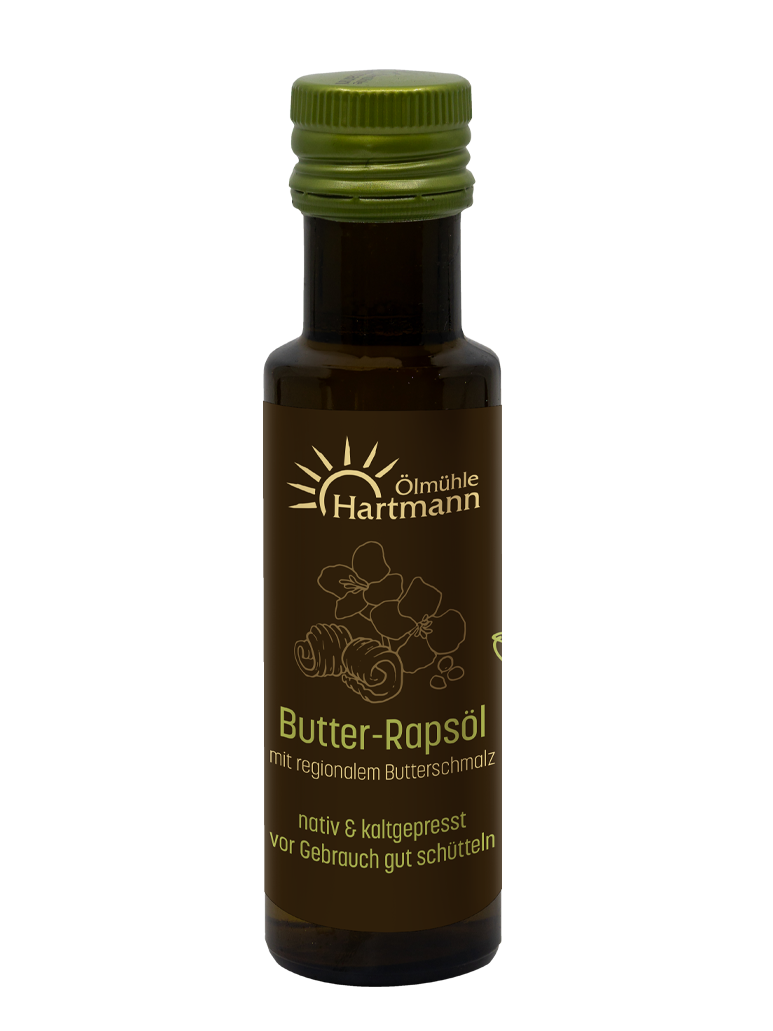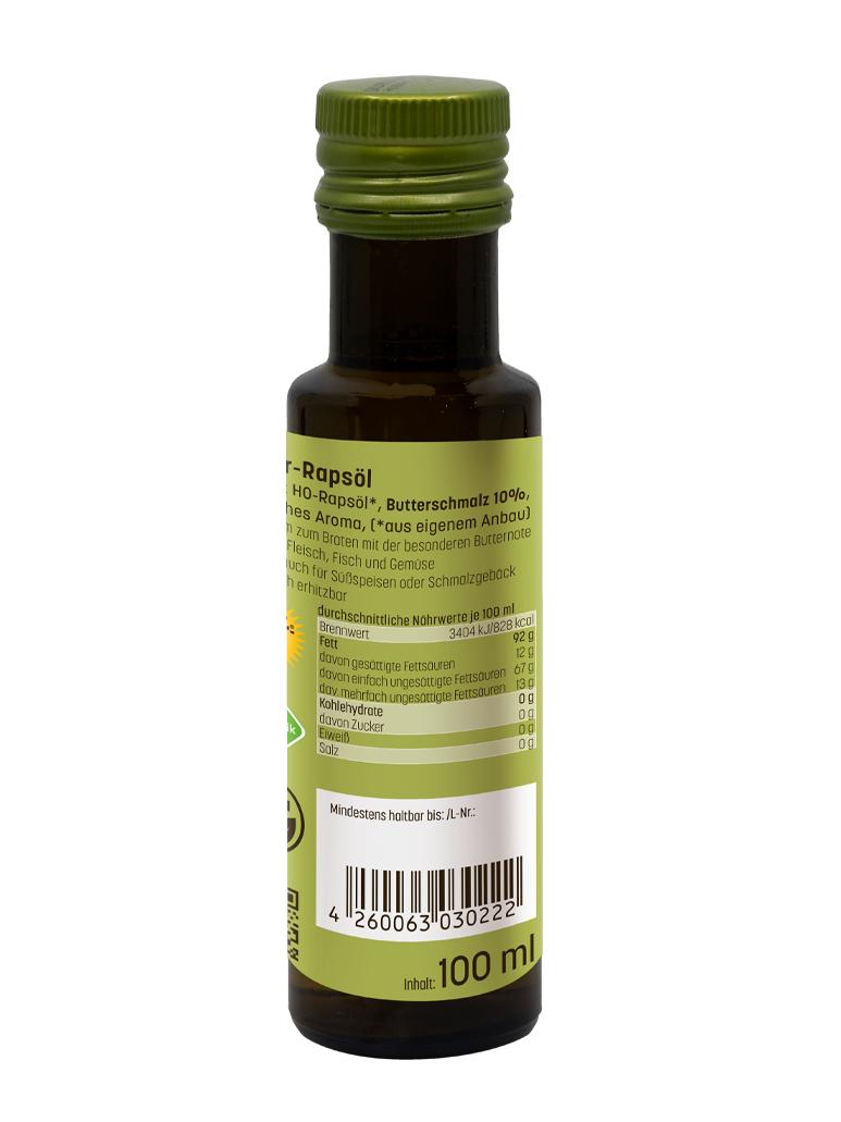 - Butter-Rapsöl – hoch erhitzbar mit feiner Butternote, ideal zum Braten, Kochen und Backen.