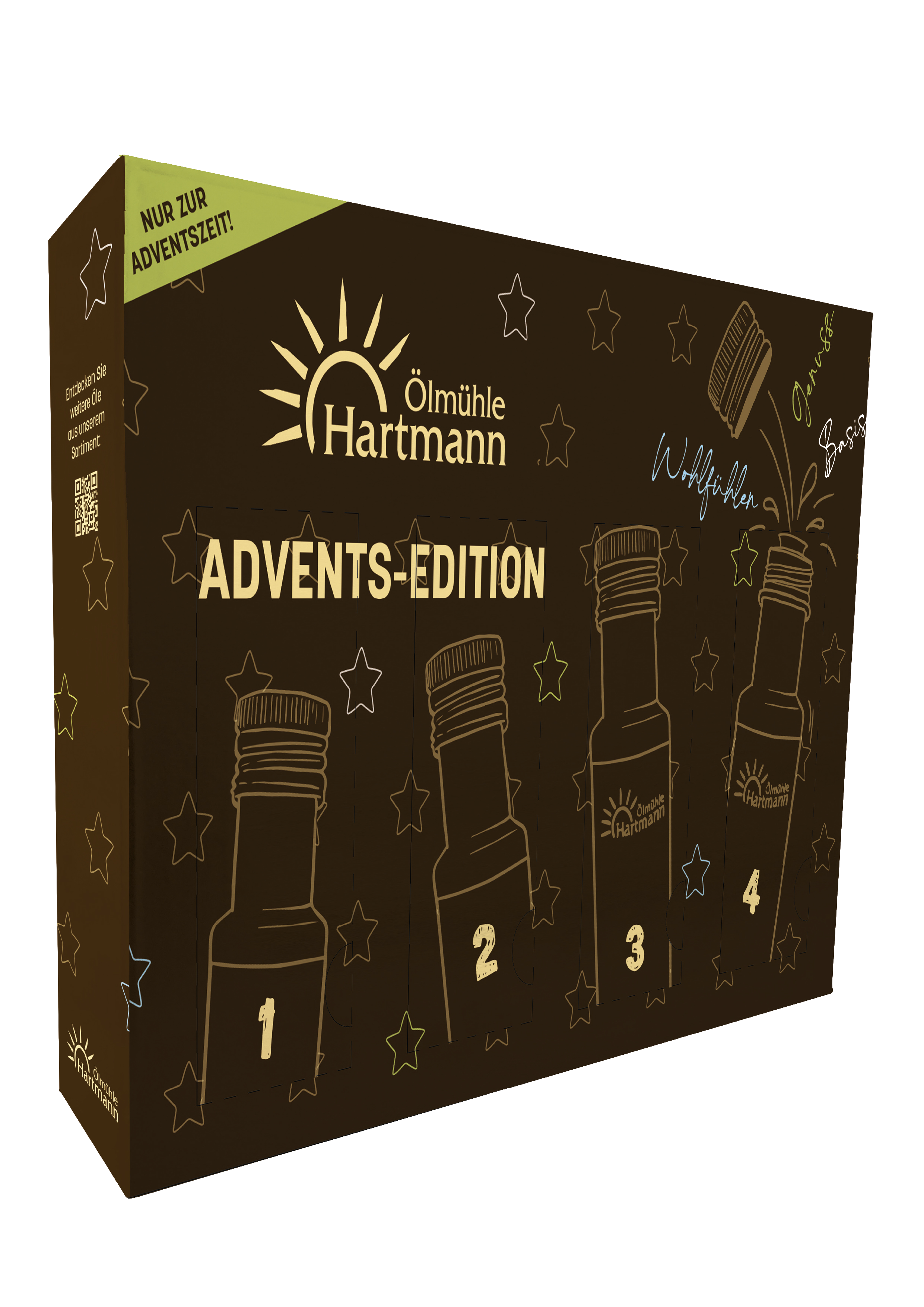 Die Adventszeit ist die Zeit der kleinen Freuden – Kerzen, Plätzchenduft, festliche Mahlzeiten. Mit der Advents-Edition der Ölmühle Hartmann wird daraus ein kulinarisches Erlebnis: ein Öl-Adventskalender mit vier kaltgepressten Premium-Ölen. Jeder Adventssonntag überrascht Sie mit einer neuen 100-ml-Flasche feinster Öle – liebevoll verpackt, limitiert und einzigartig.