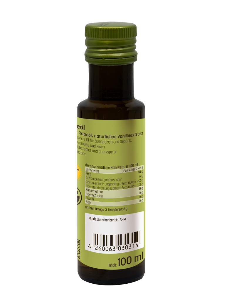 - Vanilleöl – sinnlich und warm, perfekt für Desserts, Gebäck, Gemüse und Fisch.