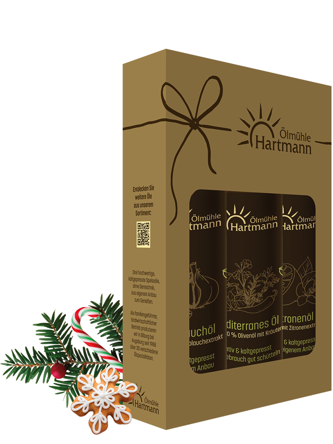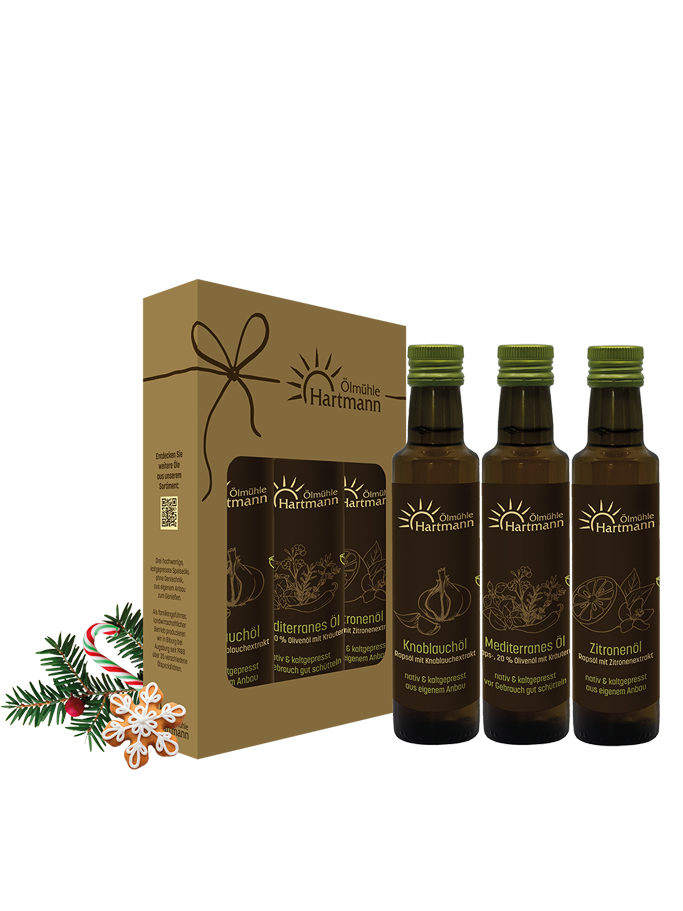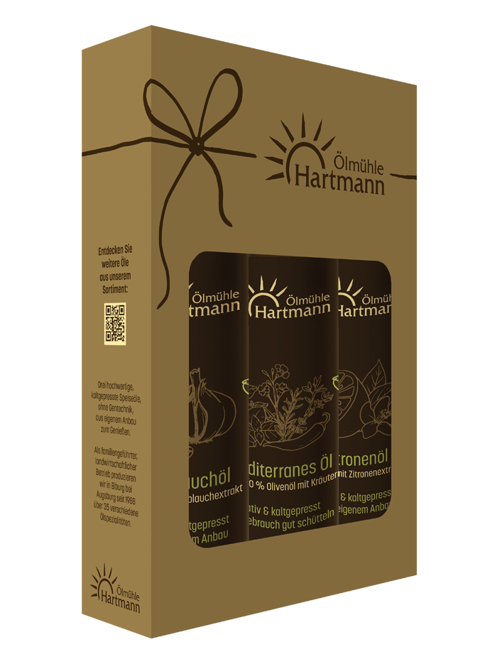 Dieses edle Geschenkset von der Ölmühle Hartmann vereint drei kaltgepresste Öl-Spezialitäten in einer ansprechenden Verpackung. Es enthält unser beliebtes Zitronenöl, das aromatische Knoblauchöl und das unübertroffene Mediterrane Öl. Jedes Öl wird aus hochwertigem Rapsöl hergestellt, das in erster Kaltpressung aus eigenem Anbau gewonnen wird. Die perfekte Geschenkidee für Genießer und Hobbyköche!