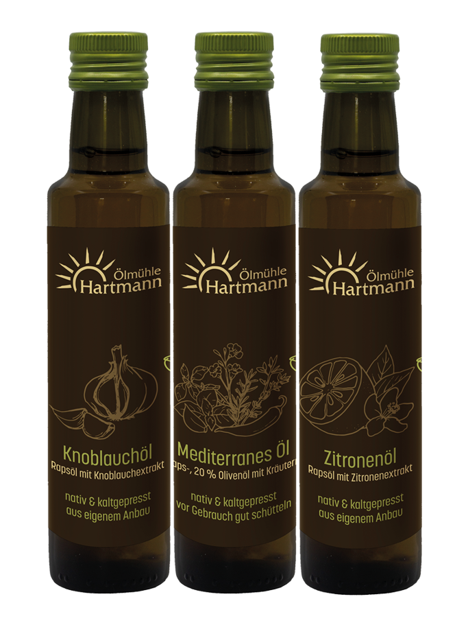 - Knoblauchöl: Rapsöl mit Knoblauchextrakt. Der besondere Geschmack für Salate, Nudelgerichte, Fisch und Fleisch. Sehr ergiebig.