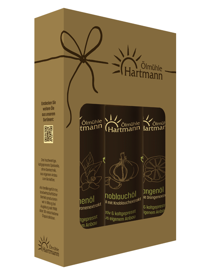 Dieses edle Geschenkset von der Ölmühle Hartmann vereint drei kaltgepresste Öl-Spezialitäten in einer ansprechenden Verpackung. Es enthält unser beliebtes Zitronenöl, das aromatische Knoblauchöl und das süß-fruchtige Orangenöl. Jedes Öl wird aus hochwertigem Rapsöl hergestellt, das in erster Kaltpressung aus eigenem Anbau gewonnen wird. Die perfekte Geschenkidee für Genießer und Hobbyköche!