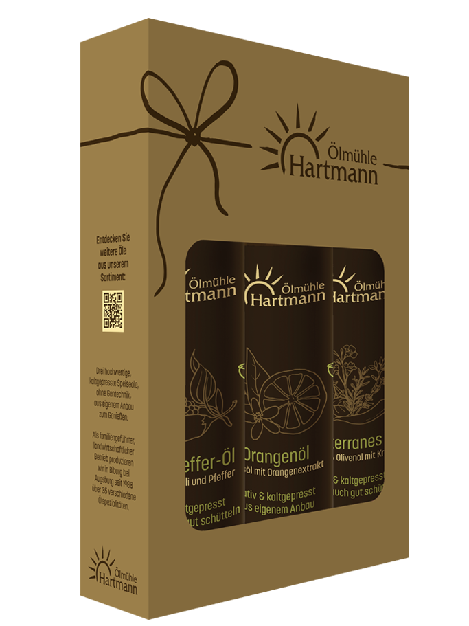 Dieses edle Geschenkset von der Ölmühle Hartmann vereint drei kaltgepresste Öl-Spezialitäten in einer ansprechenden Verpackung. Es enthält unser beliebtes Chili-Peffer-Öl, das aromatische Mediterrane Öl und das süß-fruchtige Orangenöl. Jedes Öl wird aus hochwertigem Rapsöl hergestellt, das in erster Kaltpressung aus eigenem Anbau gewonnen wird. Die perfekte Geschenkidee für Genießer und Hobbyköche!