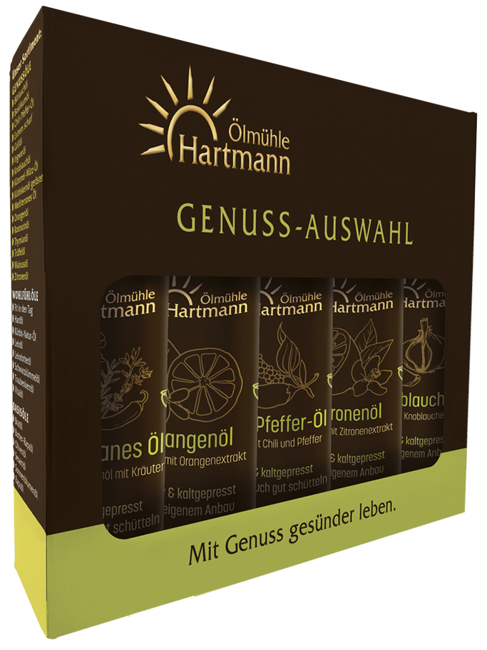 Diese Genuss-Auswahl von der Ölmühle Hartmann bietet ein exklusives Set aus fünf kaltgepressten Öl-Spezialitäten, die jedes Gericht verfeinern und für besondere Genussmomente sorgen. Dieses Set enthält: Zitronenöl, Chili-Pfeffer-Öl, Mediterranes Öl, Orangenöl und Knoblauchöl. Bitte beachten: Je nach Verfügbarkeit können Abweichungen in der Auswahl auftreten.