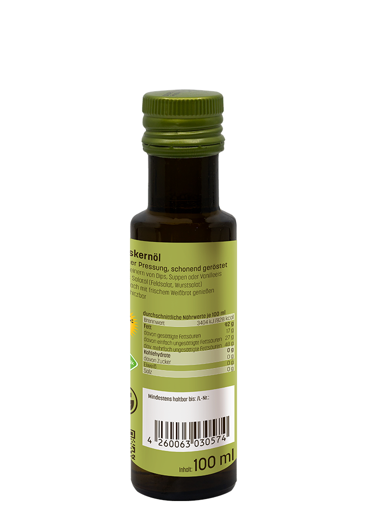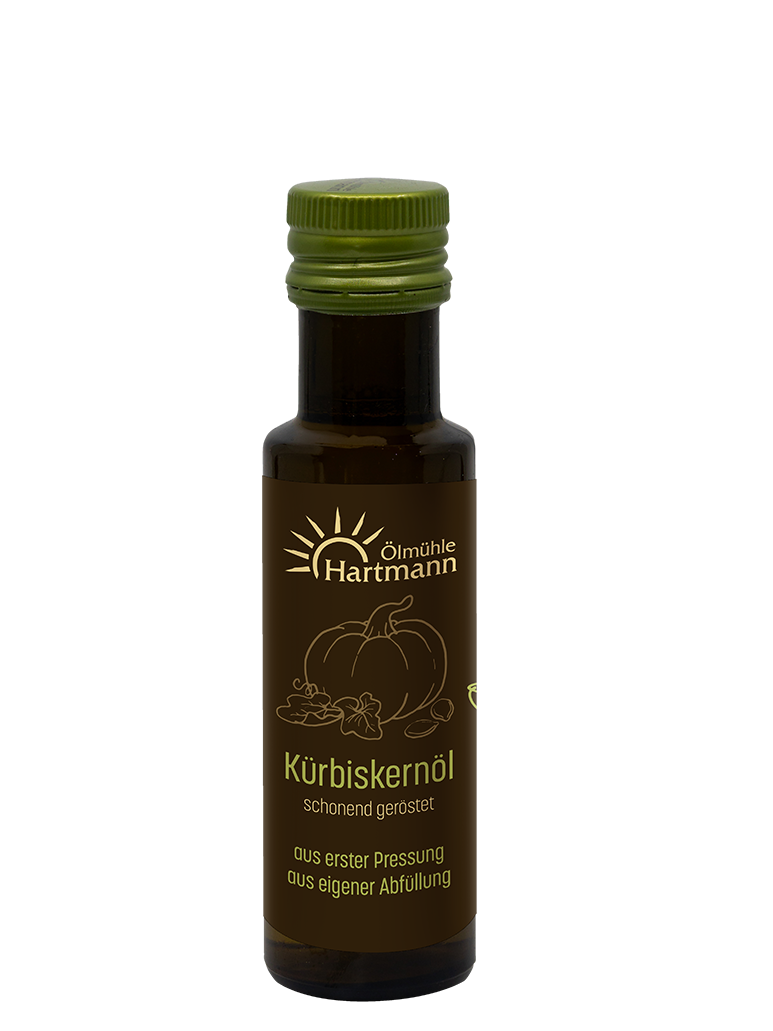 Unser Kürbiskernöl aus der Ölmühle Hartmann wird aus schonend gerösteten Kürbiskernen in erster Pressung gewonnen. Das Ergebnis ist ein hochwertiges Öl mit intensivem, nussig-kräftigem Aroma, das perfekt für die Verfeinerung verschiedenster Gerichte geeignet ist. Selbstverständlich ist unser Kürbiskernöl frei von Gentechnik.