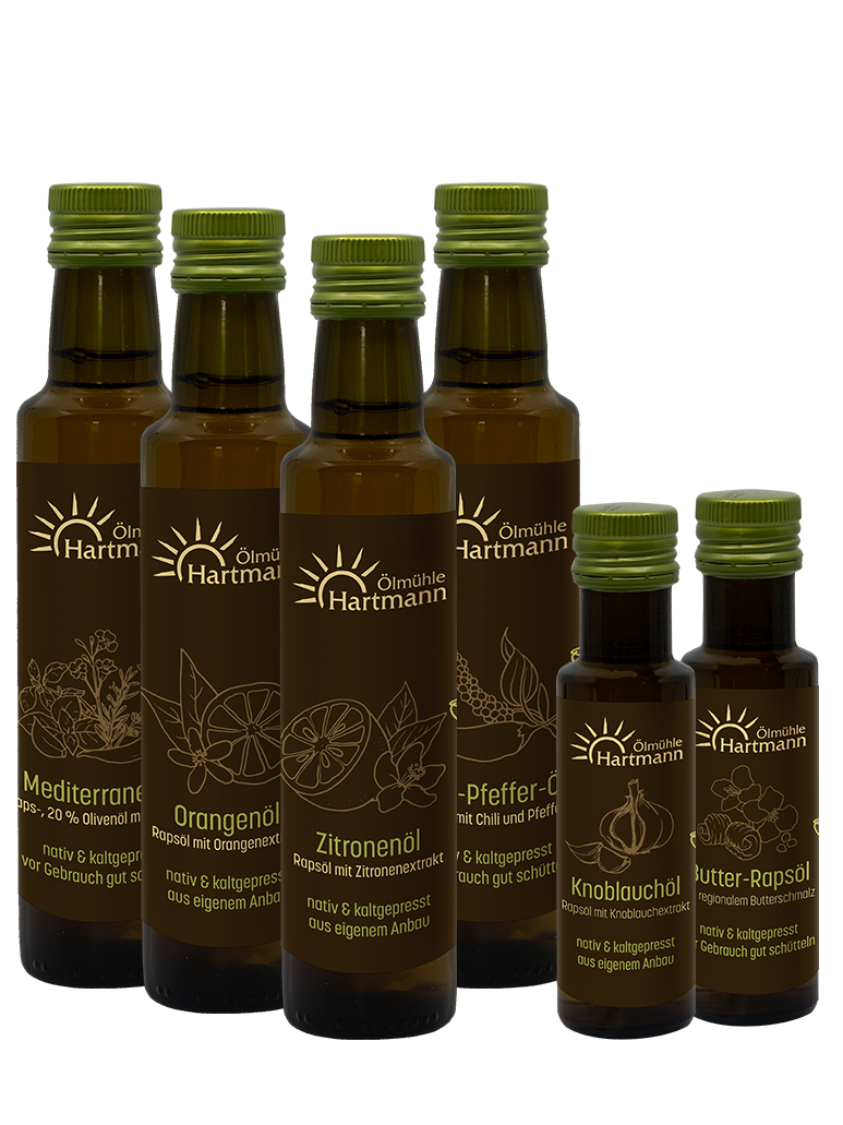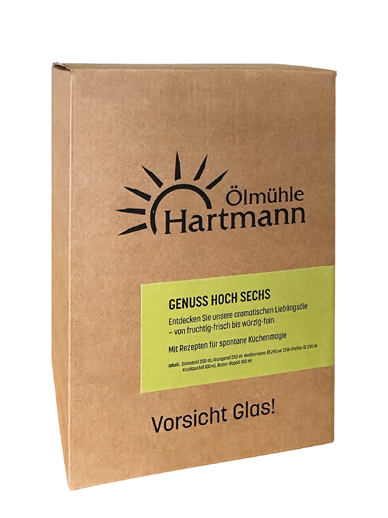 Dieses exklusive Sortiment der Ölmühle Hartmann nimmt Sie mit auf eine kulinarische Reise durch sechs unserer beliebtesten Öl-Spezialitäten. Von sonnig-fruchtig bis feurig-pikant – das Set „GENUSS HOCH SECHS“ vereint handwerkliche Tradition mit moderner Geschmacksvielfalt. Jedes Öl basiert auf unserem hochwertigen Rapsöl aus eigenem bayerischem Anbau, das in erster Kaltpressung schonend gewonnen wird. Eine wunderbare Möglichkeit, die eigene Küche zu veredeln oder einem lieben Menschen eine genussvolle Freude zu bereiten.